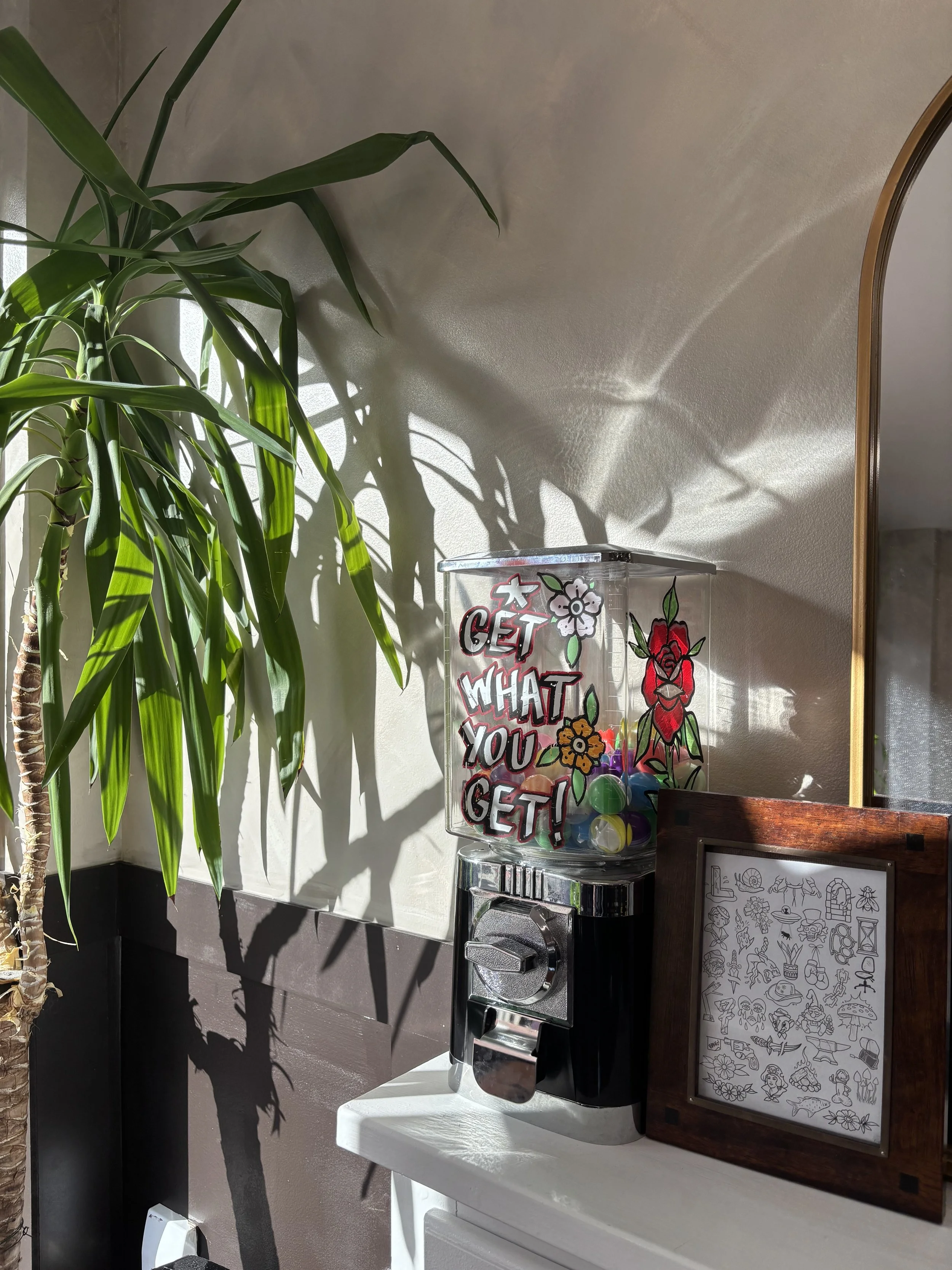 Our artist Brux offers a ‘get what you get’ gumball machine service for anyone who wants a fun surprise tattoo!